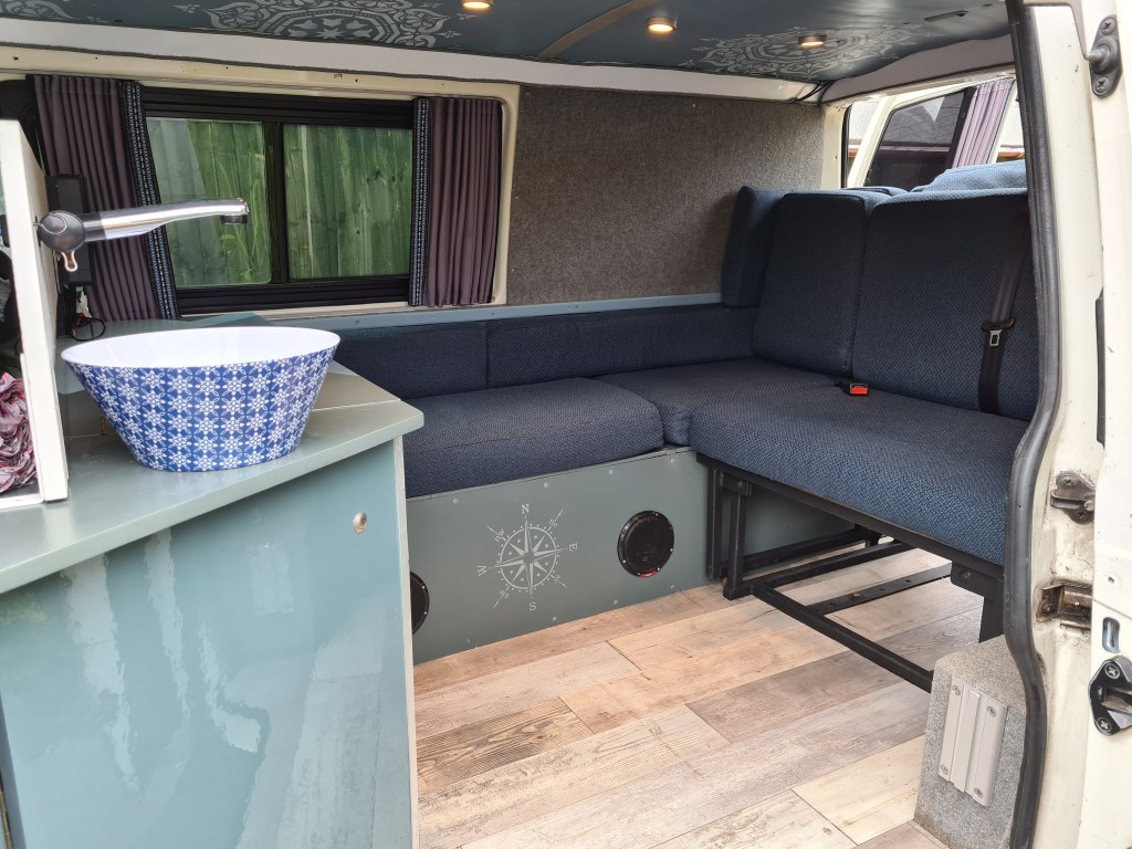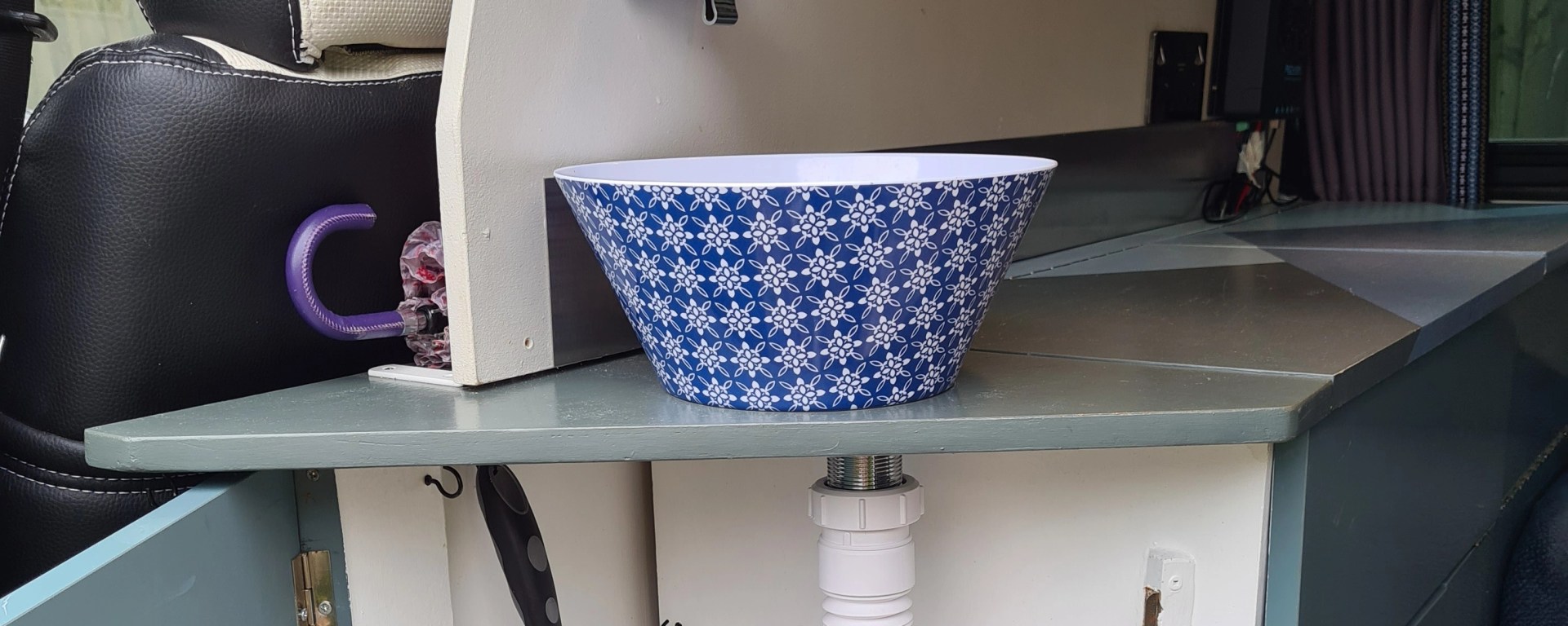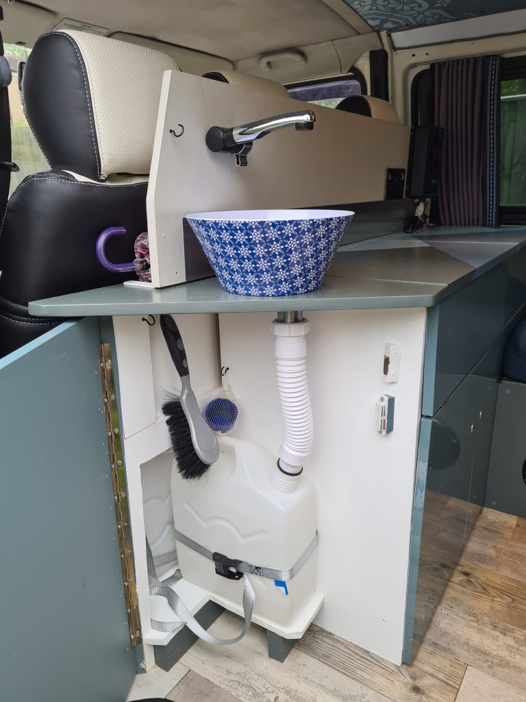 I chose to make my own sink out of a melanin bowl which I found to be aesthetically pleasing. I housed a 5l jug in the cupboard directly below for waste water and a second behind the “bulkhead” units to hold the fresh water. This is reached via the cupboard.