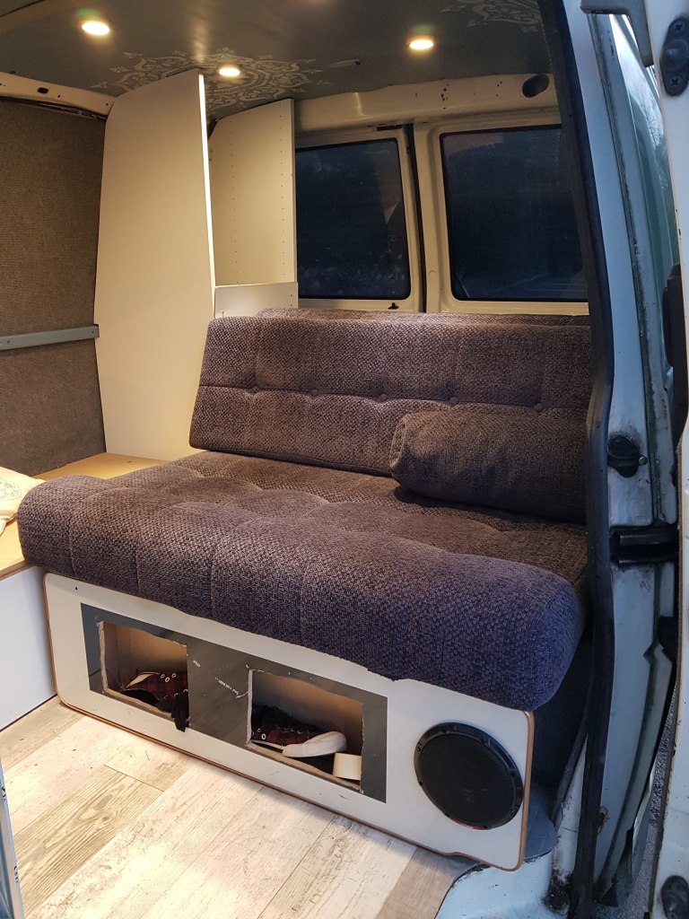My layout choice is unusual. The standard T4 conversion has a 3/4 width seat/bed with a bank of cupboards along one side which house the stove and fridge. I grew up with campers of this layout and while I can confirm that they are hugely practical, I wanted to have more lounging space. I also don’t have the concern of squeezing in a family of four (or more!) as it is just my husband and I.